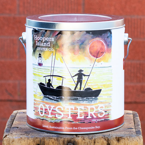 Hoopers Island Chesapeake Heritage Oyster Collection is modeled after the oyster cans used in the 19th and 20th centuries and popular with antique collectors today. Each oyster tin features artwork created by a local artist that depicts scenes from our beautiful Eastern Shore and watermen's heritage.