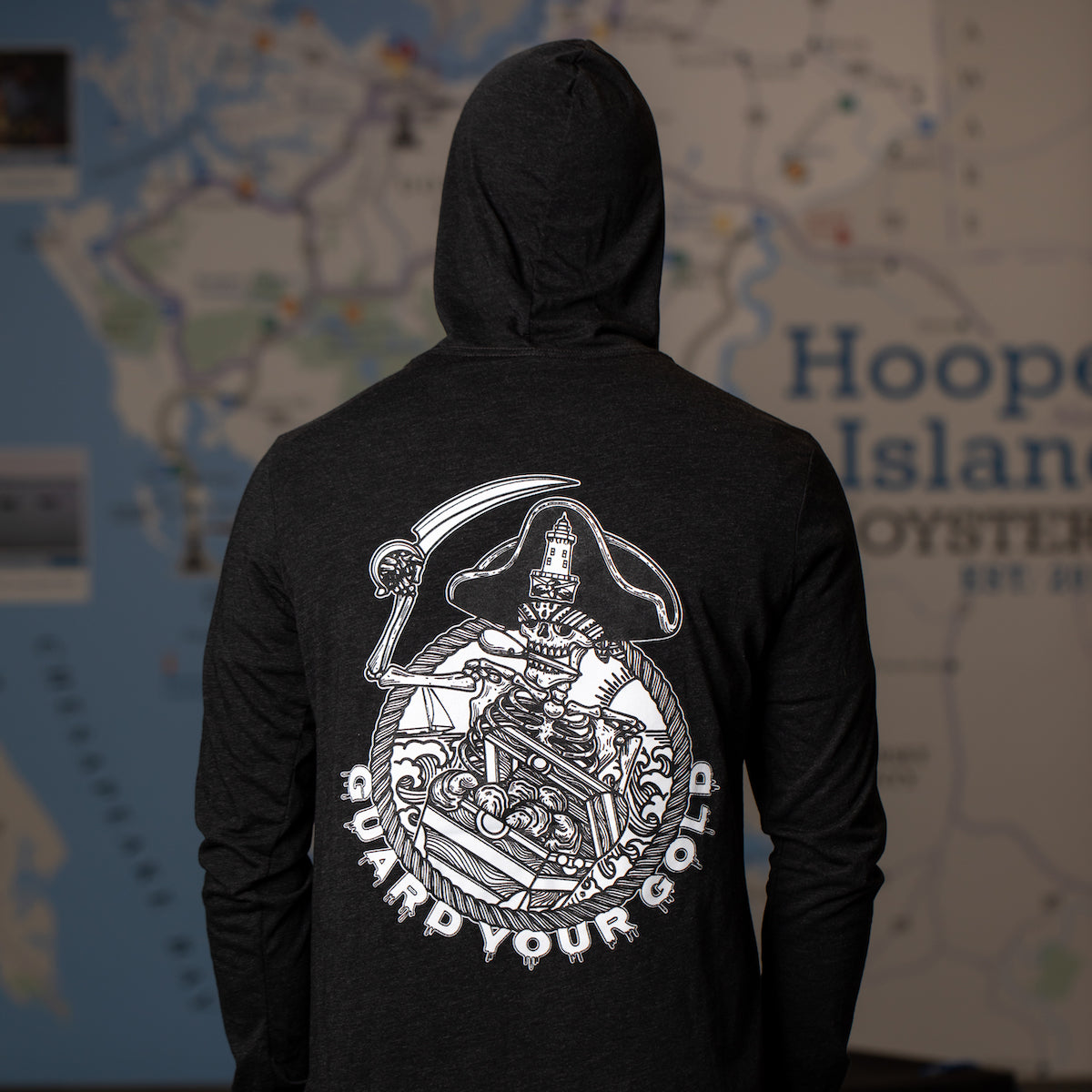 This tri-blend long sleeve hoodie features a swashbuckling skeleton clenching an oyster knife and wearing an oversized tricorn hat. The cheeky graphic celebrates the Chesapeake Bay’s privateering history and our flagship “Chesapeake Gold” oysters. The design depicts our pirate drawing a cutlass sword to protect his treasure chest – overflowing with ‘Gold’ – from Bay marauders.