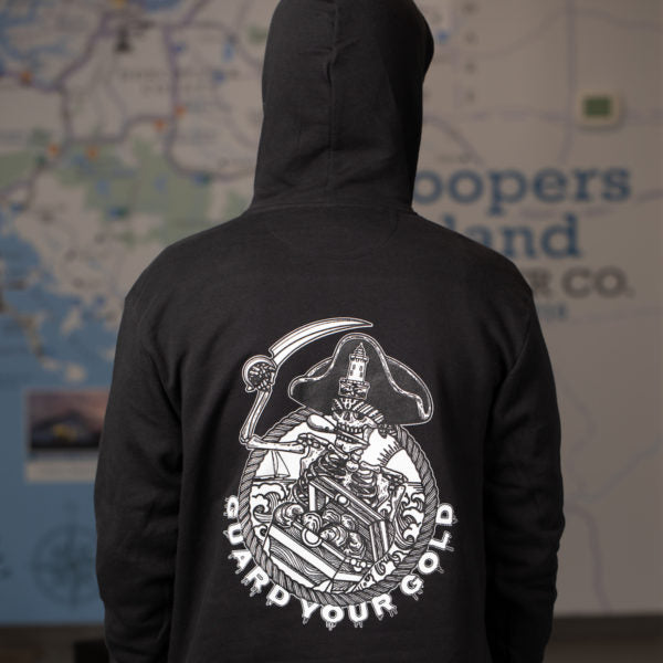 The all cotton pullover fleece sweatshirt features a swashbuckling skeleton clenching an oyster knife and wearing an oversized tricorn hat. The cheeky graphic celebrates the Chesapeake Bay’s privateering history and our flagship “Chesapeake Gold” oysters. The design depicts our pirate drawing a cutlass sword to protect his treasure chest – overflowing with ‘Gold’ – from Bay marauders.